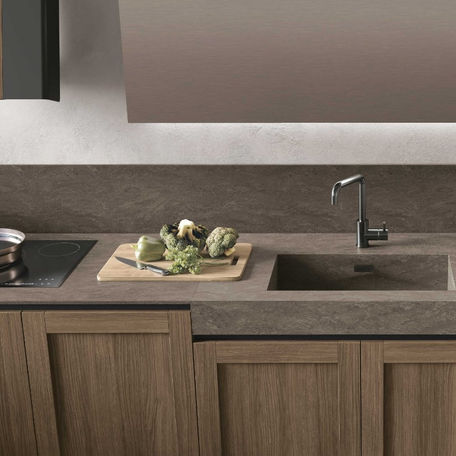 A distinctive feature of this model is the framed, wood panel door, which takes on a creative, unconventional style. Robust and decisive in appearance, these kitchens offer unique tactile and visual sensations thanks to the materials with which they are finished.